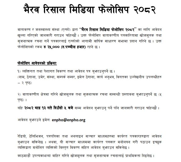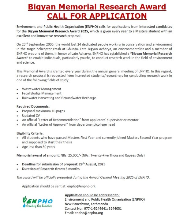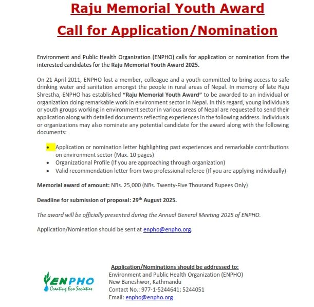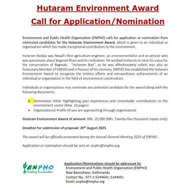 ENPHO calls for applications or nominations from interested candidates for the following awards and fellowships: 1. Bhairab Risal Media Fellowship 2025 2. Bigyan Memorial Research Award 2025 3. Hutaram Environment Award 2025 4. Raju Memorial Youth Award 2025